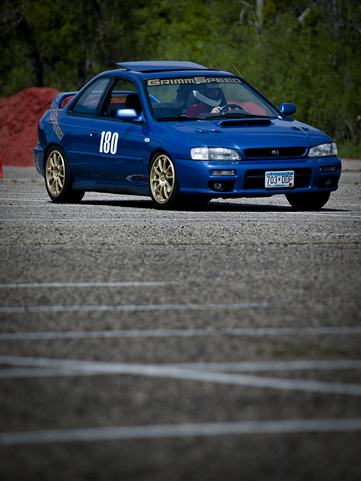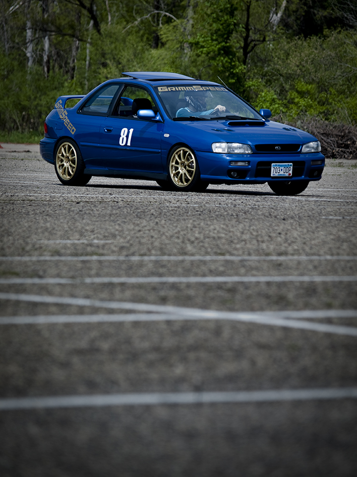 I took these wide open, with a max shutter speed of 1/4000. It froze the action, so you don’t really get the motion blur that you wanna see in an action shot, but I really wanted to get that shallow DOF, and have that shown in the foreground. I also darkened the foreground a little to put the focus back on the car. I caught these shots as the guys were putting this through a tight turn, so you can kind of see the slight compression on the front right side of the car due to the turn. Also, it does show the GrimmSpeed decals pretty well. 1st photo is my buddy Sean driving, and the 2nd is my buddy Chad (also the guy in the climbing pic from a previous post).