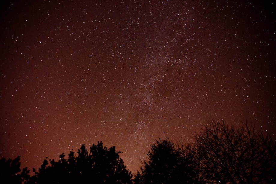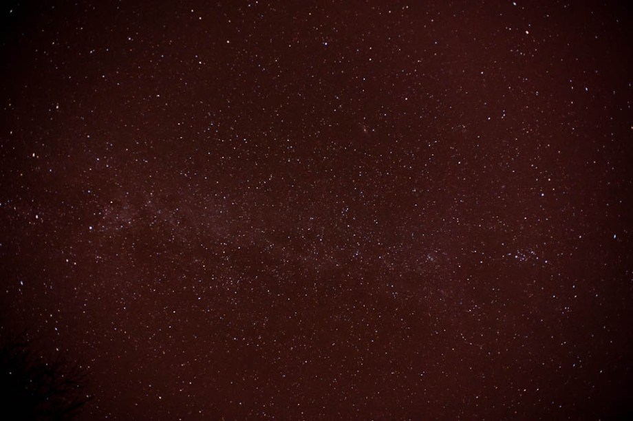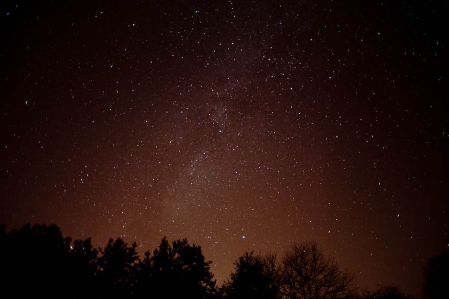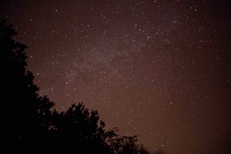 Went home to visit the ‘rents today, and thought I’d take some star photos.  My hometown is about 20 minutes outside of Lansing, MI, (which is to say, 20 minutes into the boonies), so there is less light pollution than the city, but it’s not completely absent.  My buddy Andrew had sent me a shot of what I think is called a star field (correct me if I’m wrong), and I figured I’d give it a shot.  The sky was clear enough, but I definitely think it’d be better if I was further away from any large light sources polluting my sky and my photos. 🙂