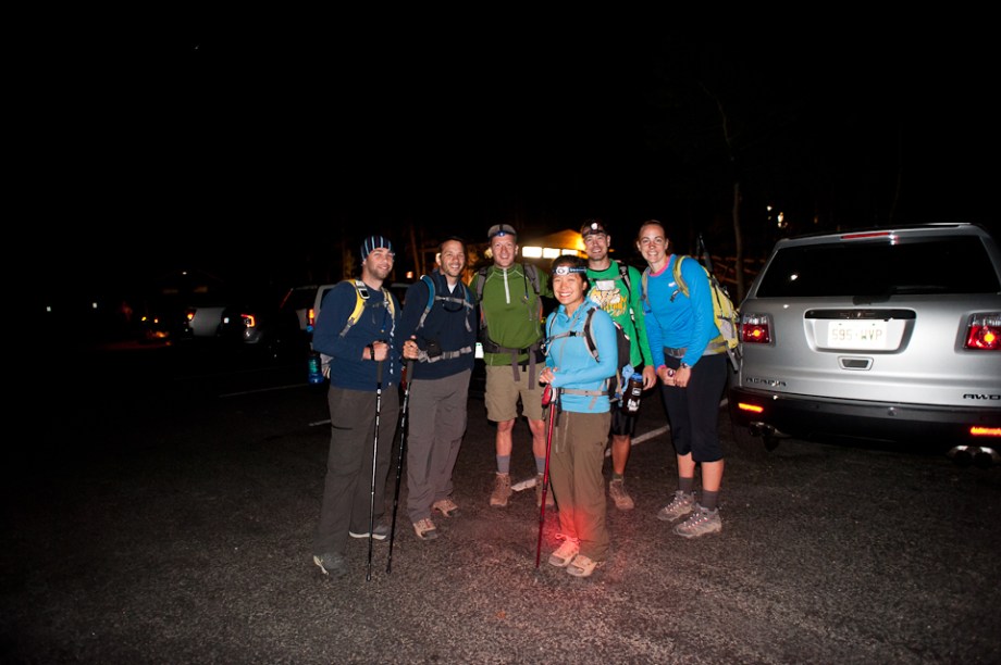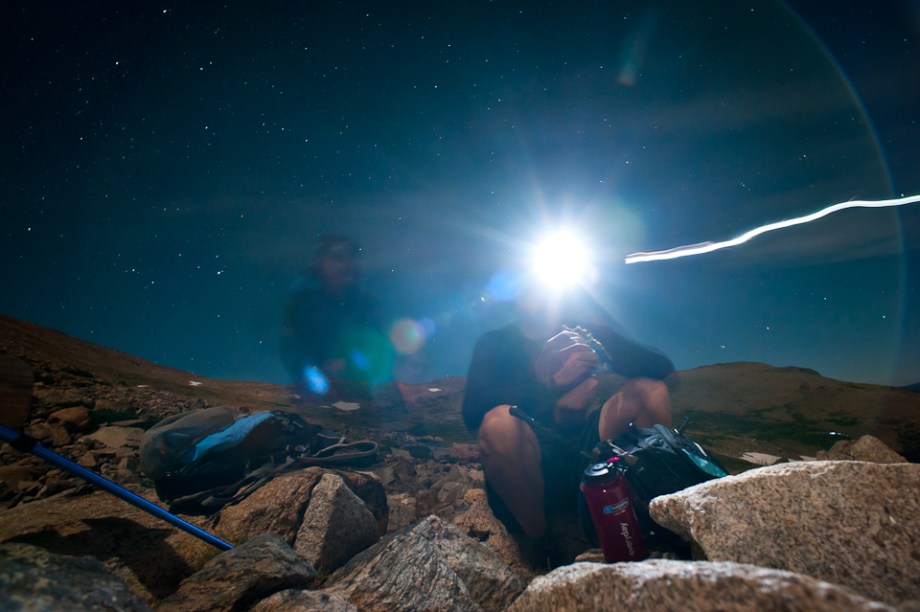 The reason I think it’s worth listing my gear is that without these items, the hike would have been a lot more miserable than it already was (even writing this over a month later, I still haven’t forgotten how taxing this hike was). The night before, we assembled all of our gear, made sandwiches, and filled our hydration packs, and water bottles with a 50/50 mixture of gatorade and water. From the warm-up hike, I knew I’d need at least 4L of water. We went to bed around 10:30pm on wednesday night, and got up at 1:30am on Thursday in order to get to the trailhead by 2am, giving us ample time to get up and down below the treeline by early afternoon to avoid exposing ourselves to thunderstorms with no cover. We ended up getting into the parking lot at around 2:10am, and found a dozen or so cars were already parked, and people on the trail. We got our packs on, adjusted straps, adjusted our layers for the weather. We finally hit the trail at around 2:20am or so, and by the time we had hiked .4 miles, we were stopping again to readjust our layers. It was 60 degrees, but with the hiking and altitude, we were sweating in no time.