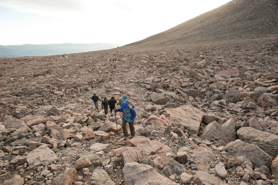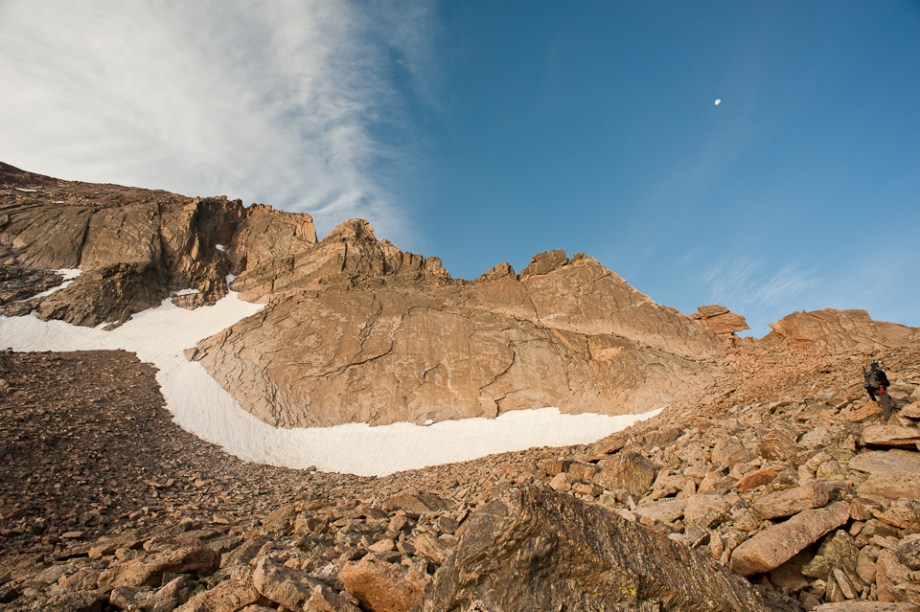 We finally approach the Boulder Field, and we start to see the Diamond face, as well as the Keyhole ever so small in the between the ridges.