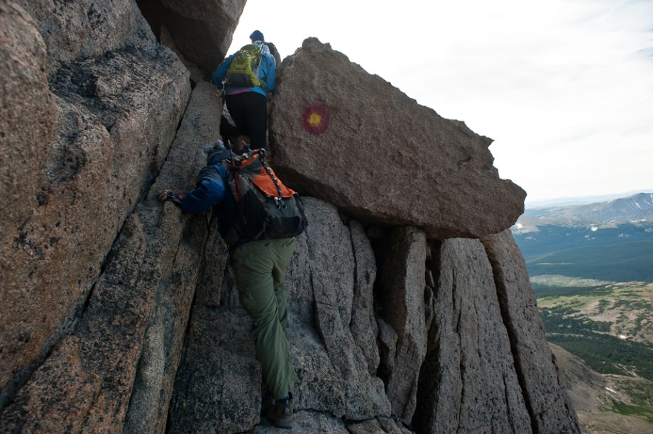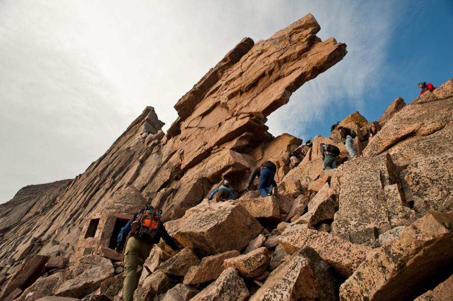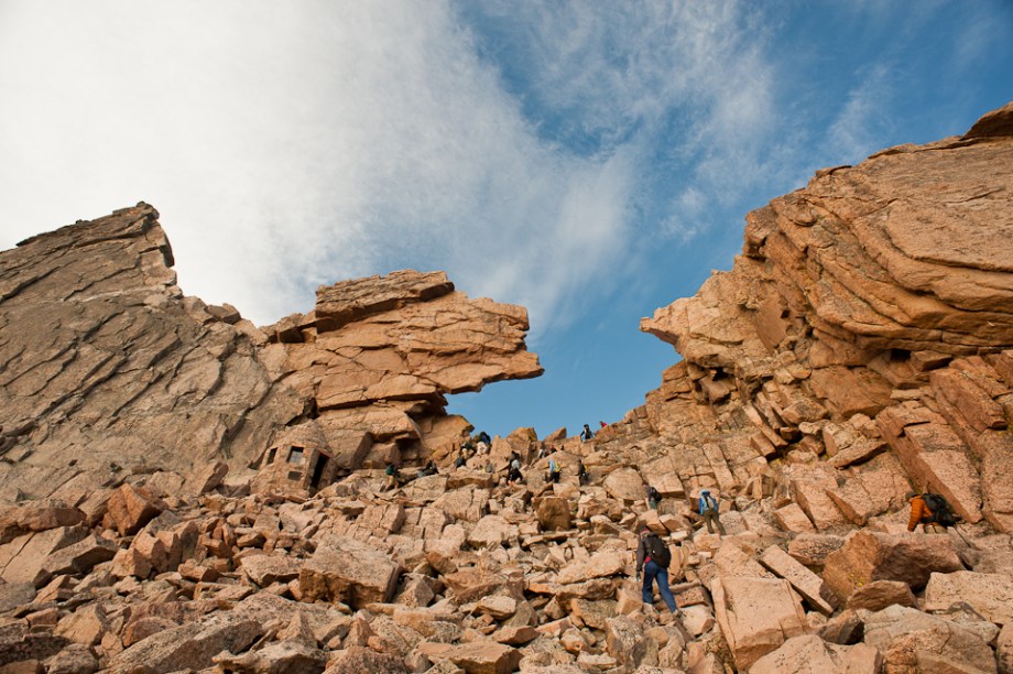 The hike from the trailhead to the summit is 8 miles (13 km) each way. Most hikers begin before dawn in order to reach the summit and return below the tree line before frequent afternoon thunderstorms bring a risk of lightning strikes. The most difficult portion of the hike begins at the Boulder Field, 6.4 miles (10 km) into the hike. After scrambling over the boulders, hikers reach the Keyhole at 6.7 miles (10.5 km).