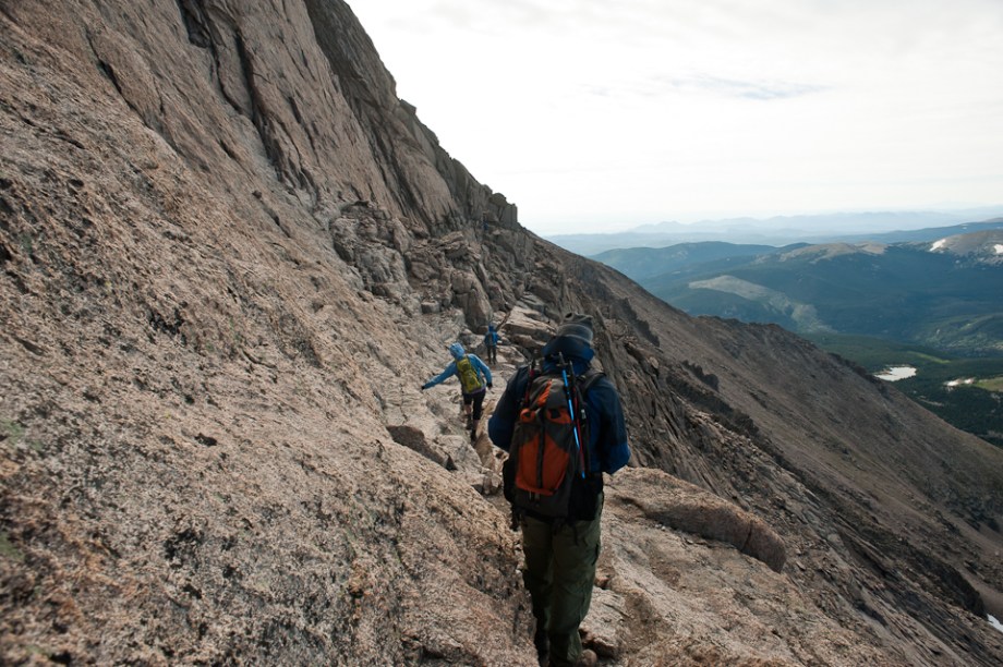 The following quarter of a mile involves a scramble along narrow ledges, many of which may have nearly sheer cliffs of 1,000 feet (305 m) or more just off the edge. The next portion of the hike includes climbing over 600 vertical feet (183 m) up the Trough before reaching the most exposed section of the hike, the Narrows. Just beyond the Narrows, the Notch signifies the beginning of the Homestretch, a steep climb to the football field-sized, flat summit. It is possible to camp out overnight in the Boulder Field (permit required) which makes for a less arduous two day hike, although this is fairly exposed to the elements. 57 people have died climbing or hiking Longs Peak. According to the National Park Service, 2 people, on average, die every year attempting to climb the mountain. In the summer of 2005 a Japanese climber was blown off a ledge after reaching the summit. On September 3, 2006 a man fell 800 feet (244 m) to his death when some rocks let go while he was descending the Loft route. Less experienced mountaineers are encouraged to use a guide for this summit to mitigate risk and increase the probability of a summit.