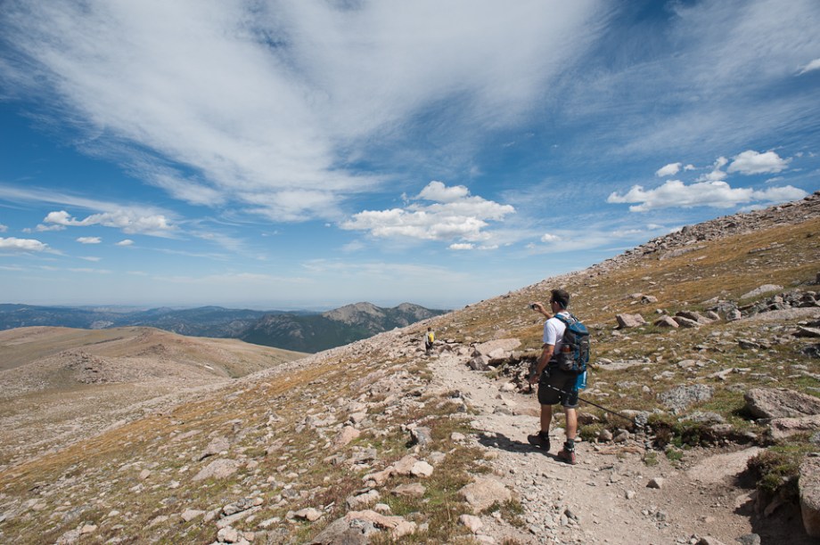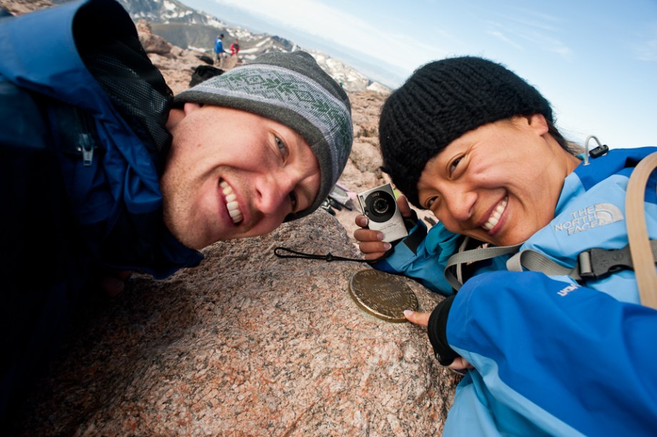 We had given ourselves a time table, so that we could complete the hike (by 10 am), spend some time on the summit (until 10:30am), and potentially be down below the treeline (by 2pm) before the afternoon thunderstorms typically start. With that in mind, and knowing I would have to be scrambling on all fours in order to stay on the wall, I didn’t want my camera dangling, swinging, and banging into the rocks (I gotta draw the line somewhere). I put my camera in my pack, and for the next 20 minutes, I made my way up the wall. My legs were weary, and I could feel my legs began to tremble with each step. And with each step, I found that I had to keep convincing myself that I could make it, even though I was breathing heavier than before. It’s hard to explain how the altitude leaves you gasping for air, as well as how tired your body gets after almost 8 hours of non-stop activity, with each step requiring your stabilizing muscles in your legs to help you maintain your balance, but it becomes more of a mental thing than anything at that point. I pushed on. Some spots were nothing but slabs, with only a thin crack with which you would have to wedge your boot and hands into to try to get up the next 6 foot stretch. The wall was angled just enough that there was not enough friction to smear you soles on the wall and walk up, but you actually had to find some handholds and footholds to make your way up. The wonderful part is, that as you are coming up, you have to stop to allow people to come down. Everyone there all provided words of encouragement, seeing how weary we were (at least how weary I was; the others had gotten ahead of me by this point). With a lot of “You’re almost there!” and “You can do it!” and “Keep it going, you’re doing great!”, I managed to finally drag myself up to the top, and breathed many rapid and deep sighs of relief. I managed to congratulate myself as I made it up saying something to the effect of “I’ve done what no man has done before! Except for all you guys, and everyone else before me…”.
