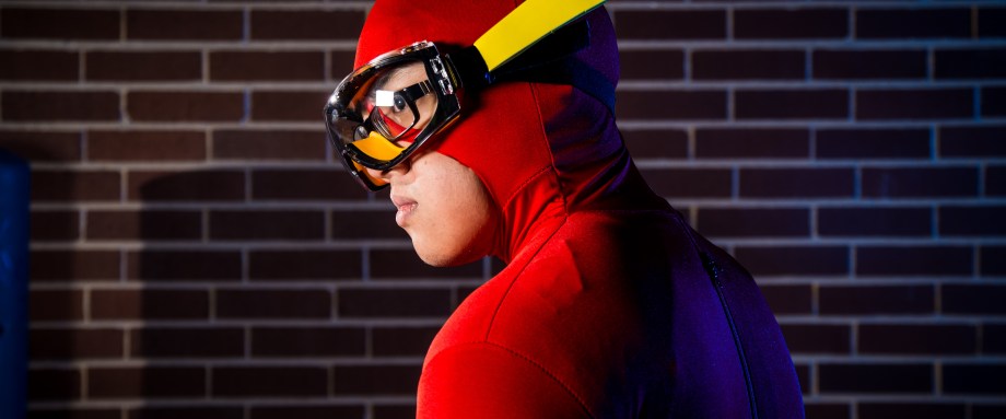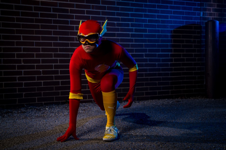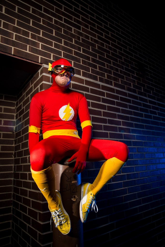 So why am I calling this blogpost, “Off Camera Flash?” Well, the intent of this was to showcase some more photos I had taken of my cousin in his homemade Flash costume which, I took, strobist style. I used 3 speedlights (flashes, if you will), and set up 2 of them, either bare, or with blue gels (gels are the colored film you’d find on theater lights, and the like, to give them a specific color), and one in a softbox, as the fill/main. I varied some of the angles, but I think they turned out pretty good. I learned a few things after evaluating the photos on my laptop, but I could do better varying the lighting ratios, but it gives me something to shoot for next time. Maybe even trying for some edginess with only hard lights, or going low key, and playing with silhouettes, or even adding textures to the shadows in the background.
